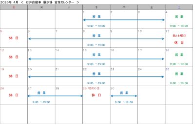 | 営業日時 | 【本社展示場】 月曜日~土曜日 9:00~19:00 第2土曜日を除く 【サービス工場】 月曜日~金曜日 8:30~17:30 |