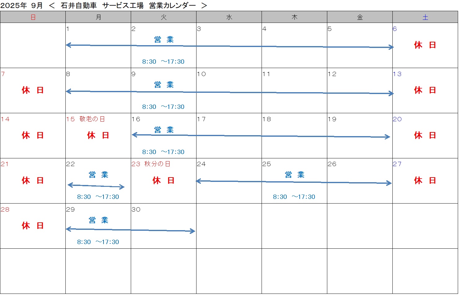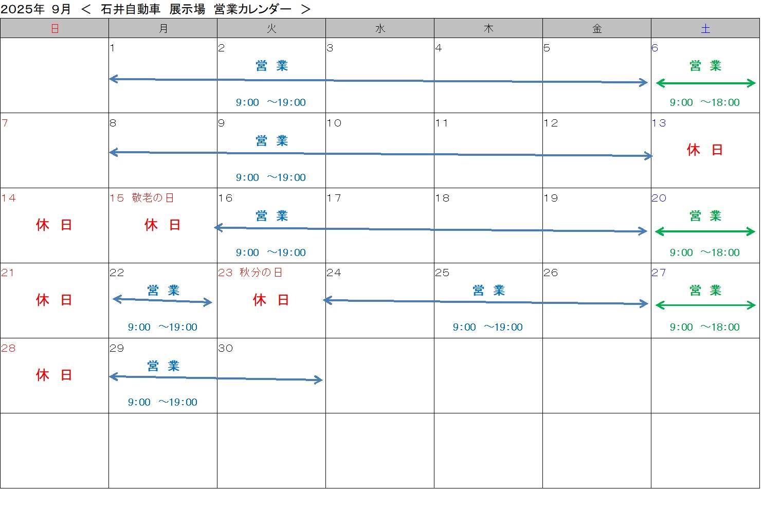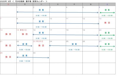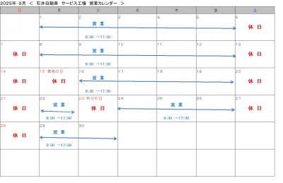 2025年9月の「本社展示場」と「サービス工場」の営業日をご案内いたします。